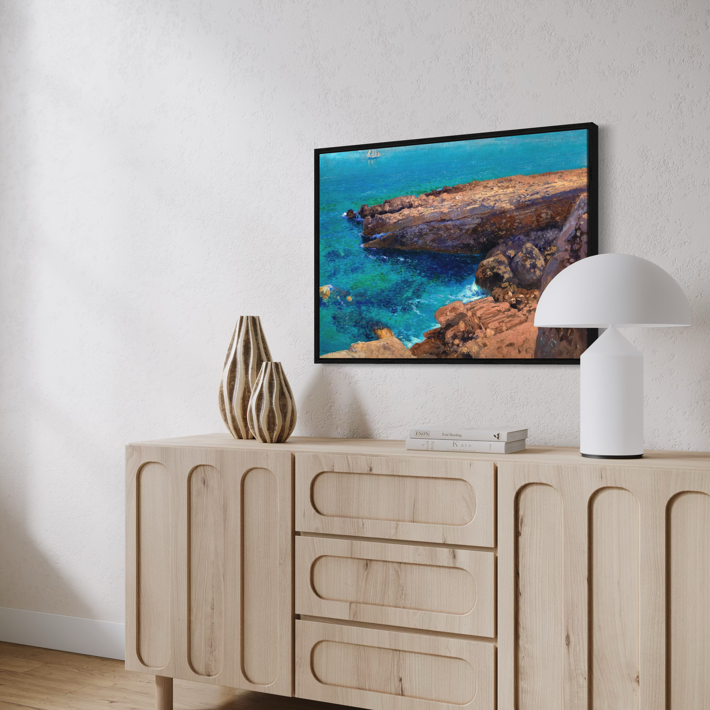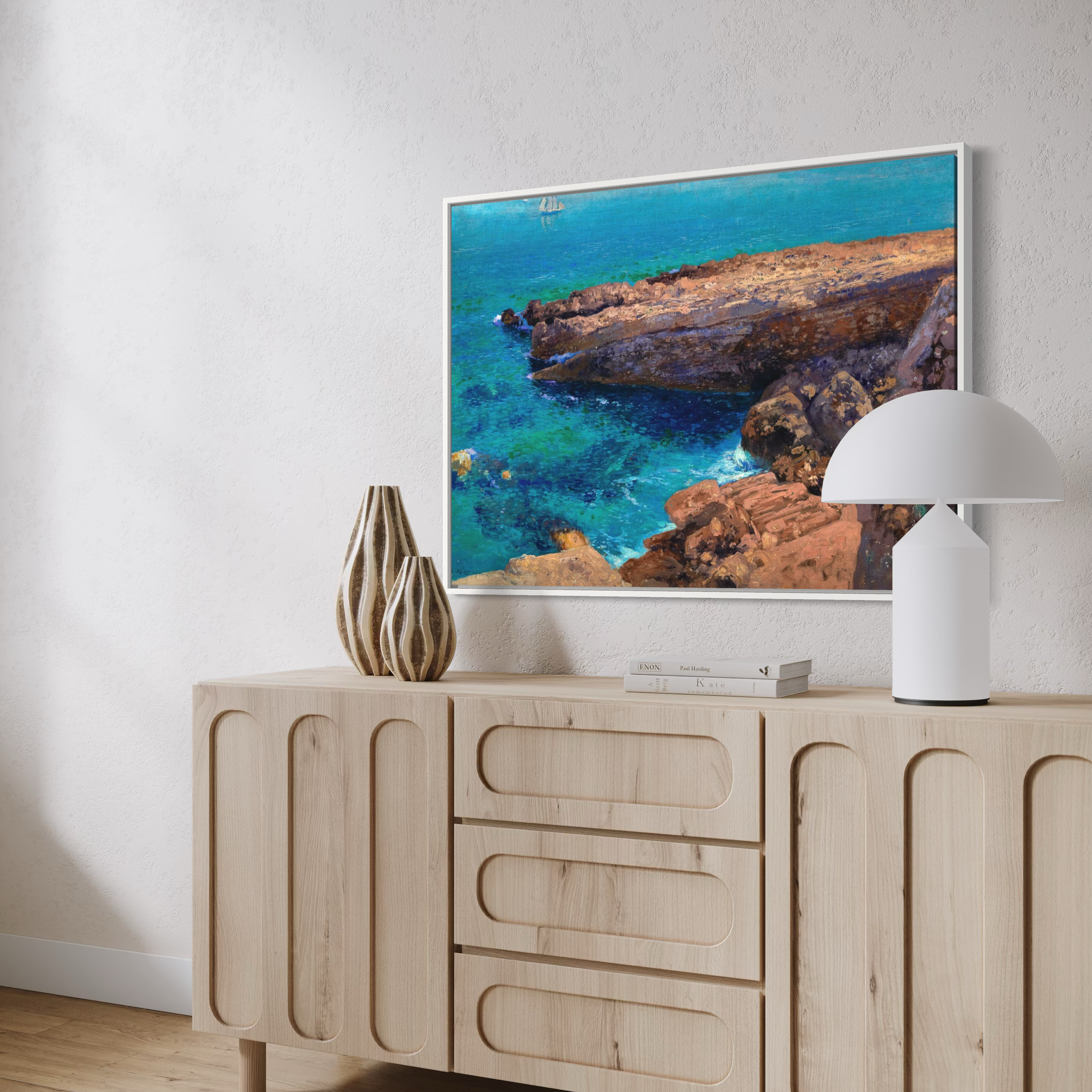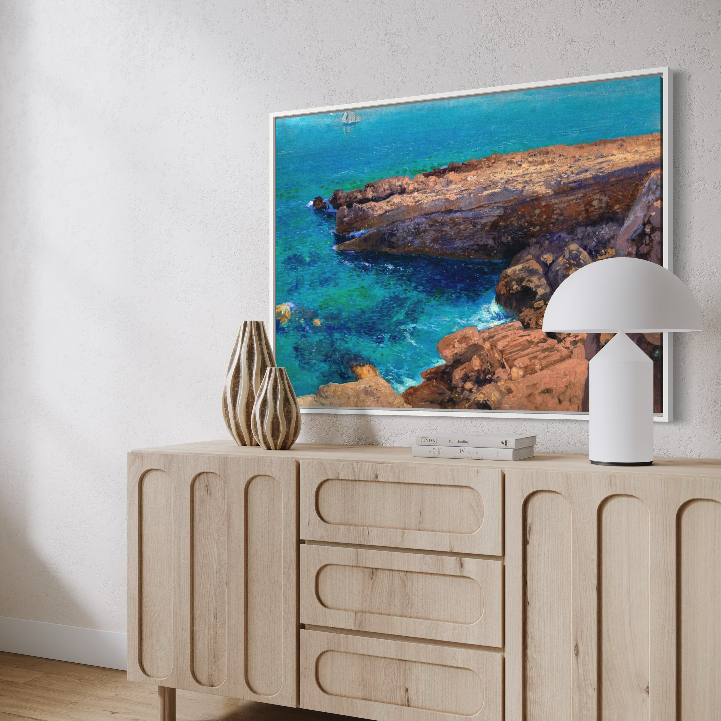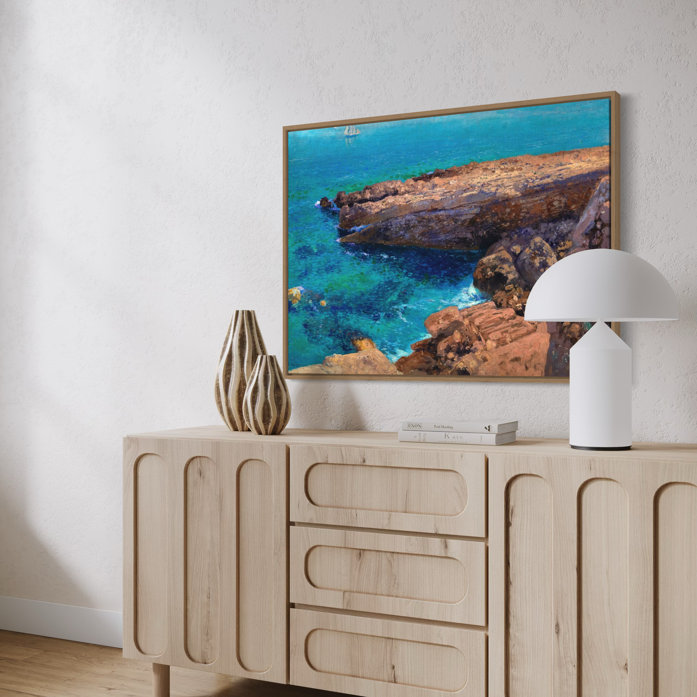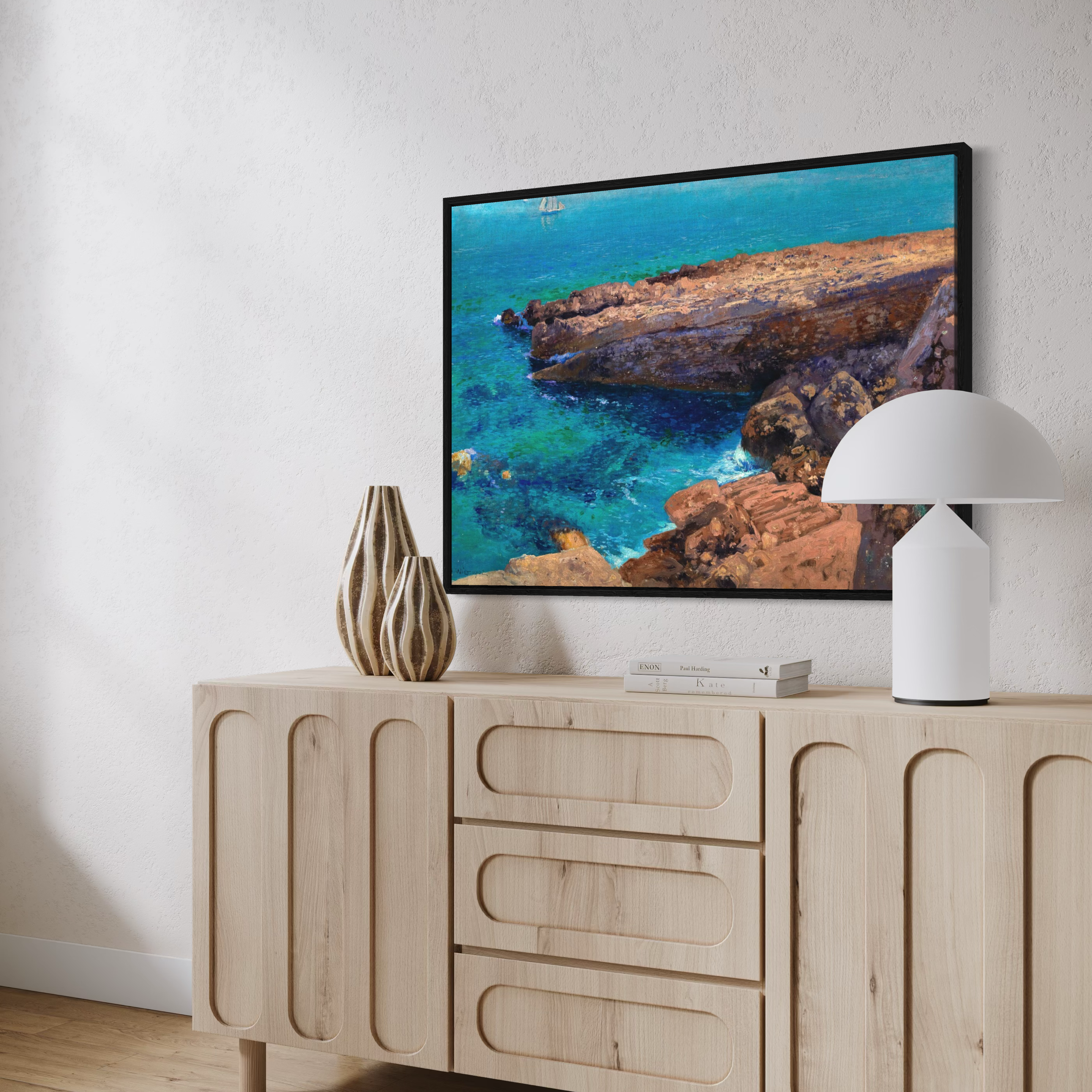 A quiet and contemplative coastal landscape by Austrian painter Hans Wilt, reproduced on gallery-grade canvas and framed in a modern floating mounting. Rocky Coast evokes a sense of timeless stillness: rocky cliffs stretch into calm waters, bathed in soft light and reflected with subtle tonal harmony. Wilt’s delicate brushwork and refined palette capture the serene interplay of stone, sea, and sky, suggesting both the strength and the tranquility of nature. Printed with archival inks and ready to hang.