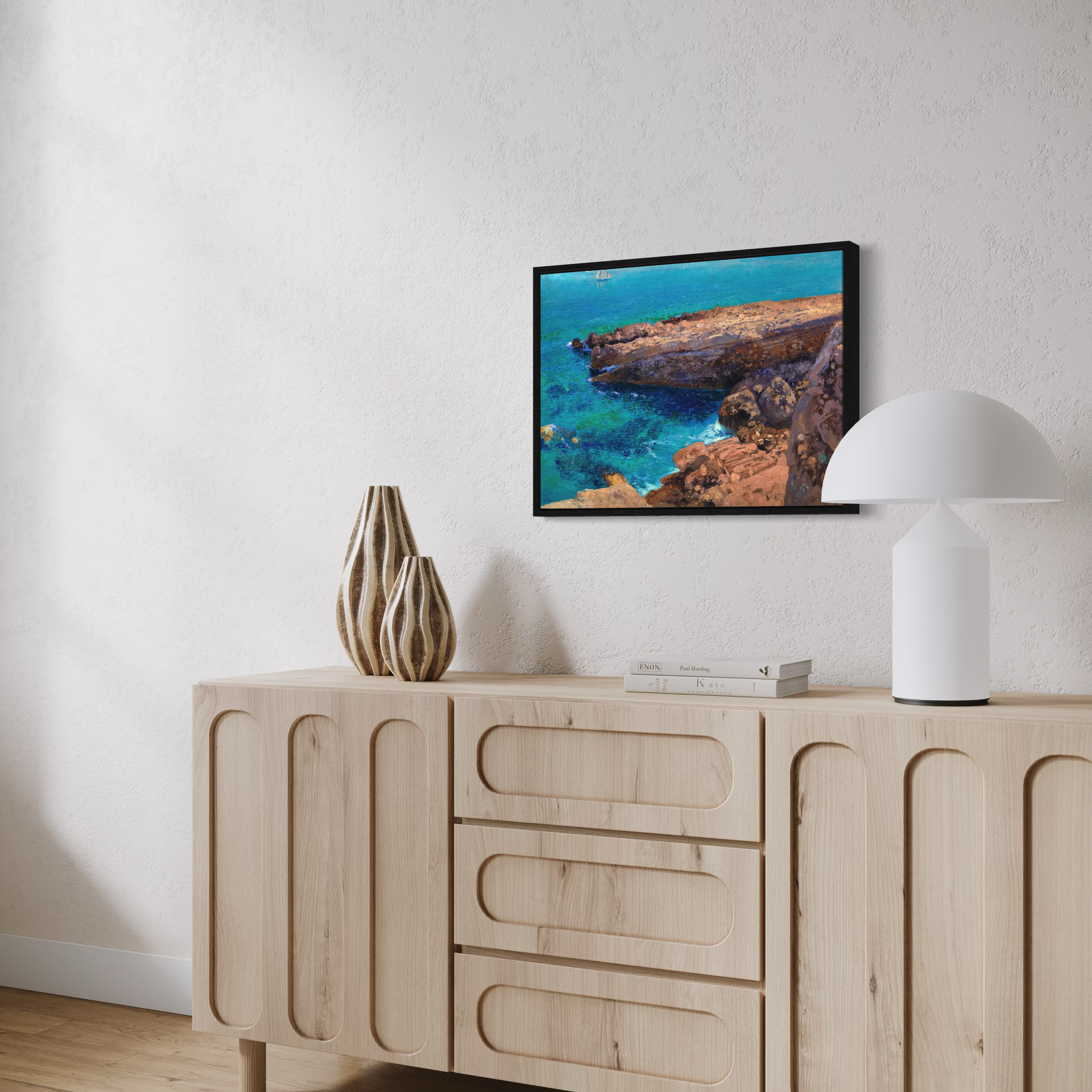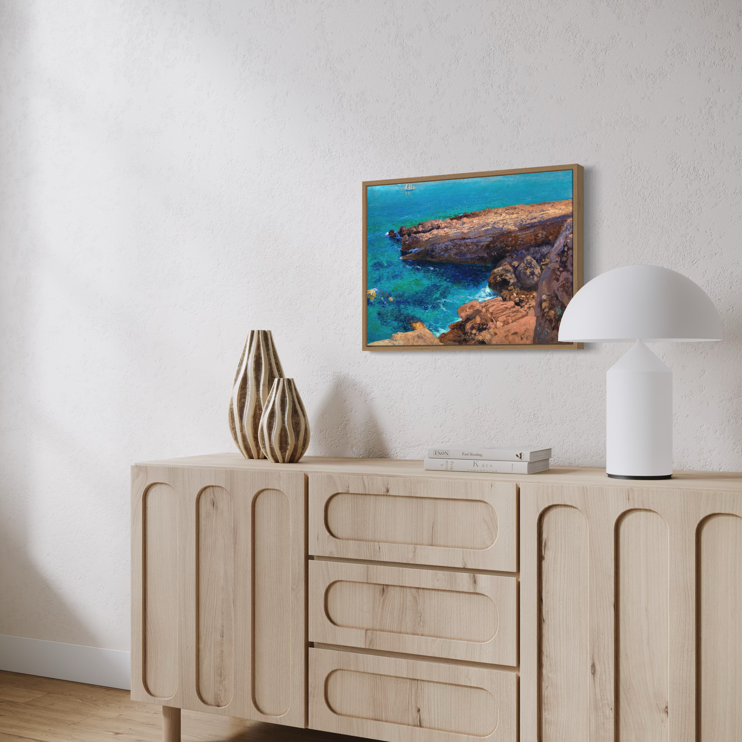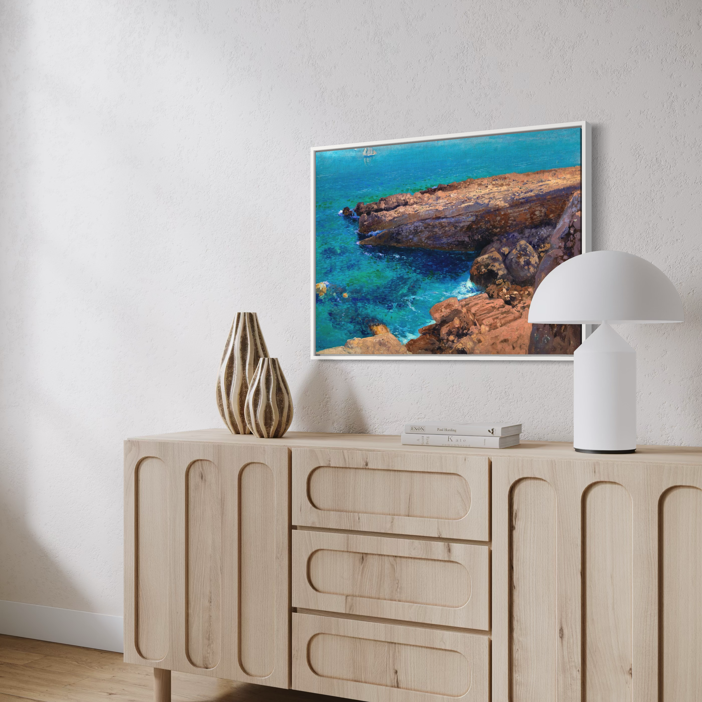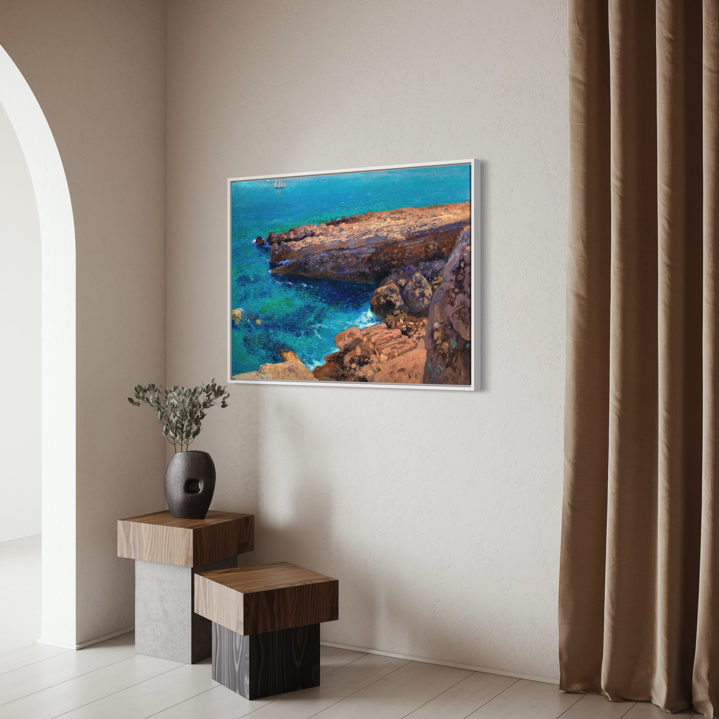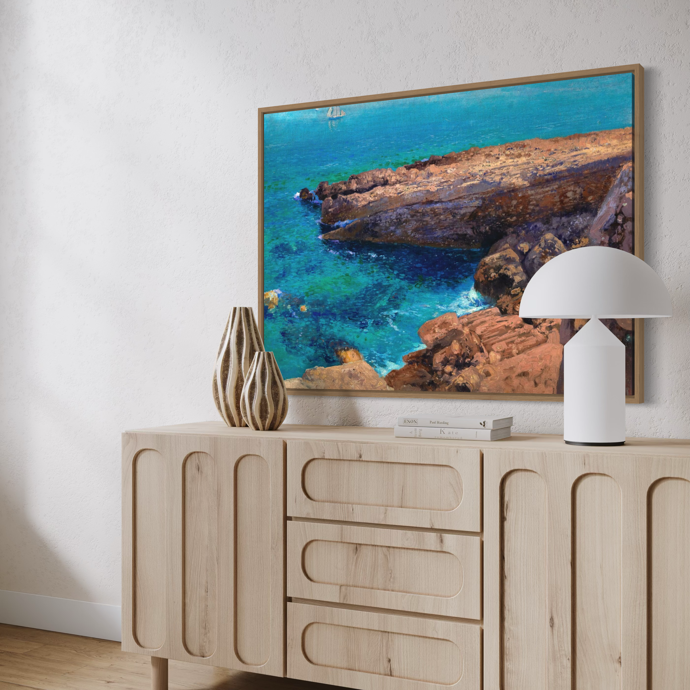 A quiet and contemplative coastal landscape by Austrian painter Hans Wilt, reproduced on gallery-grade canvas and framed in a modern floating mounting. Rocky Coast evokes a sense of timeless stillness: rocky cliffs stretch into calm waters, bathed in soft light and reflected with subtle tonal harmony. Wilt’s delicate brushwork and refined palette capture the serene interplay of stone, sea, and sky, suggesting both the strength and the tranquility of nature. Printed with archival inks and ready to hang.