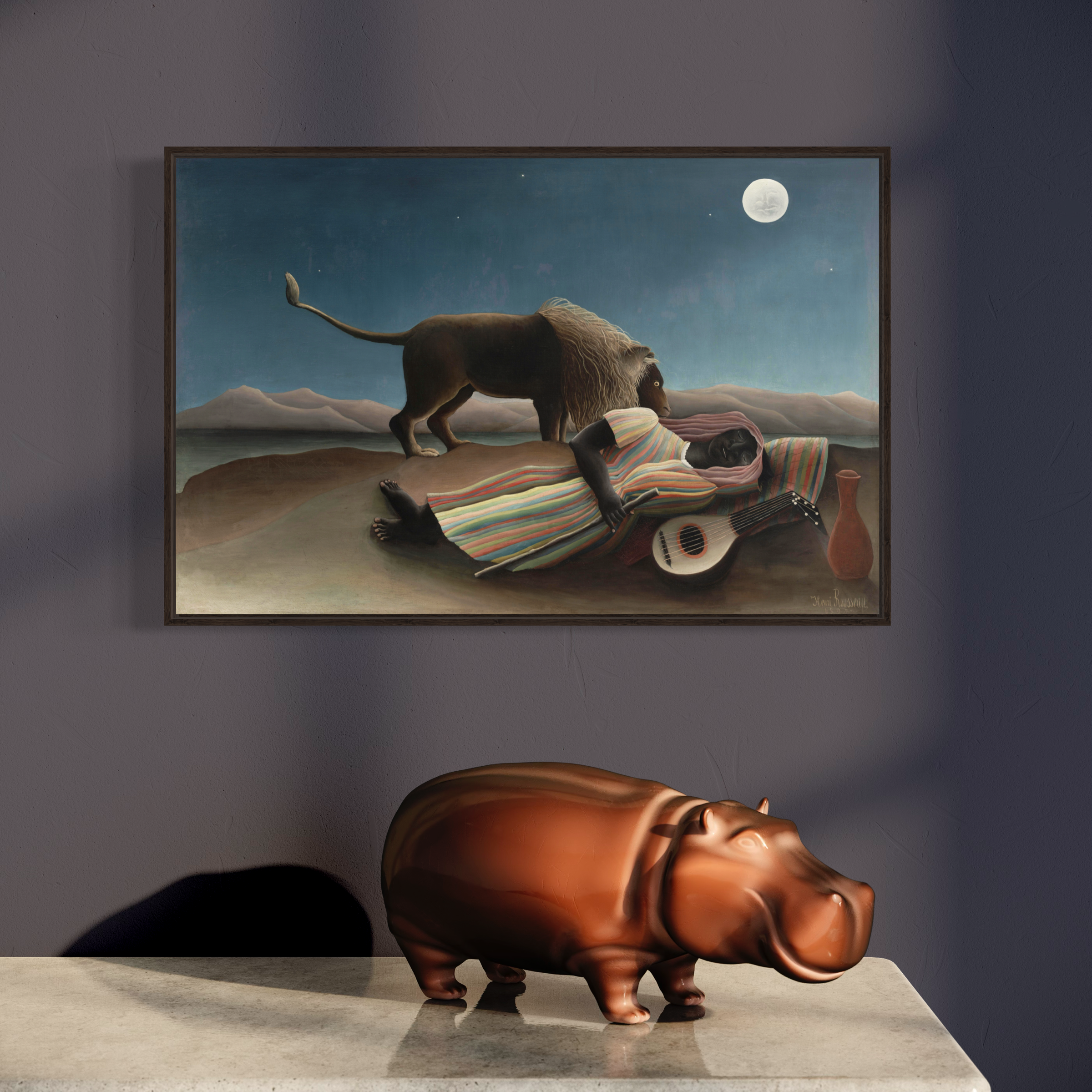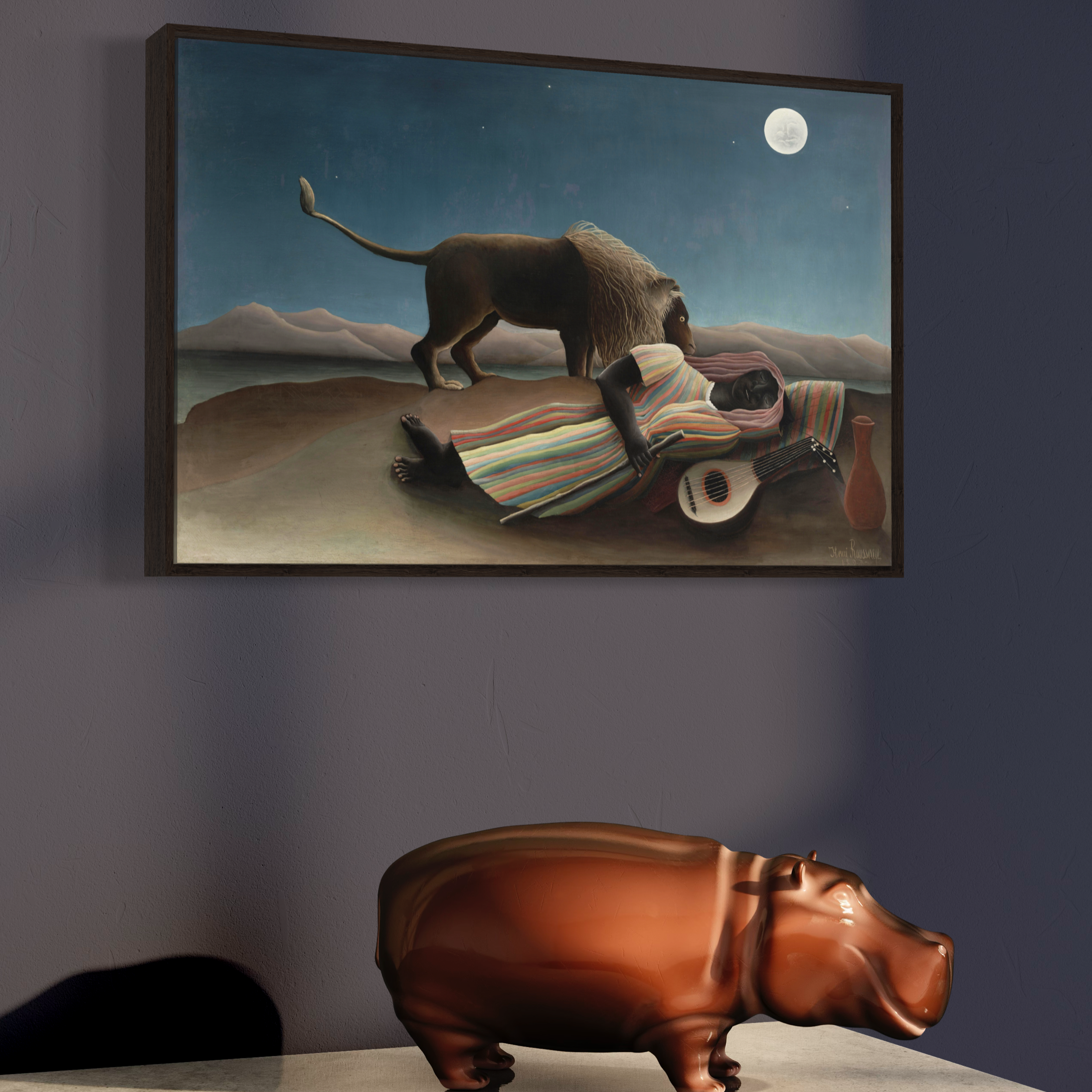 A surreal nighttime scene by Henri Rousseau, reproduced on museum-grade canvas and set in a minimalist floating frame. The Sleeping Gypsy blends dreamlike imagery with rich symbolism, depicting a lone traveler in slumber under a moonlit sky, watched over by a curious lion. Printed with archival inks and ready to hang.